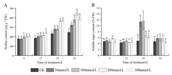 As shown in Figure 4B, at the same stress time, the difference in the SS content among the groups before treatment was insignificant. At 6 days of stress, the SS content increased at first, followed by a decrease and the highest SS content was recorded under 200 mmol/L, which was significantly different from the control, with no significant difference between other treatments and the control. At 12 days of stress, the SS content increased, followed by a decrease with an increase in the salt concentration, and the SS content under 100 mmol/L salt stress was significantly different from that of the control, and the content was the highest. At 18 days of stress, the content of SS increased at first, followed by a decrease with an increase in the salt concentration, and the SS content was significantly higher under 50 and 100 mmol/L salt stress, under 50 and 100 mmol/L salt stress, the content of SS was significantly higher than that of other treatments, and the SS content was the highest at 100 mmol/L, whereas the difference between other salt treatments and control was insignificant. At 24 days of stress, the SS content increased, followed by a decrease; however, there was no significant difference among the treatments, and the SS content was the highest at 100 mmol/L. At the same salt concentration, the SS content first increased and subsequently decreased as the stress time increased, and the peak SS content of all treatments was found on the 18th day after salt stress, which subsequently decreased significantly.
