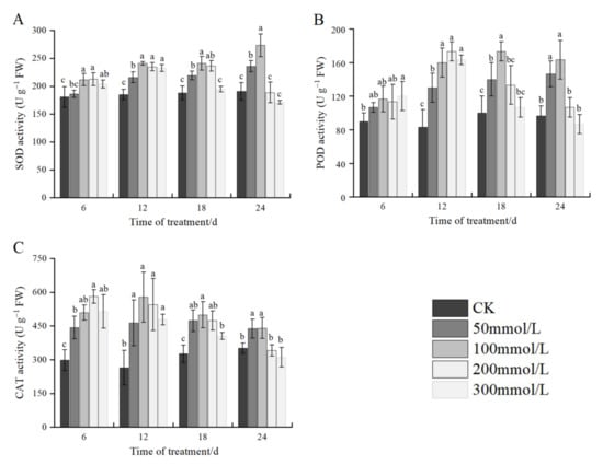Effect of salt stress on the activities of antioxidant enzymes in leaves of J. microcarpa L. seedlings. (A) Superoxide dismutase (SOD) activity, (B) peroxidase (POD) activity, and (C) catalase (CAT) activity of leaves. Error bars indicate the SD of treatment means. Different letters on the bars indicate significant differences among the treatments (p < 0.05).