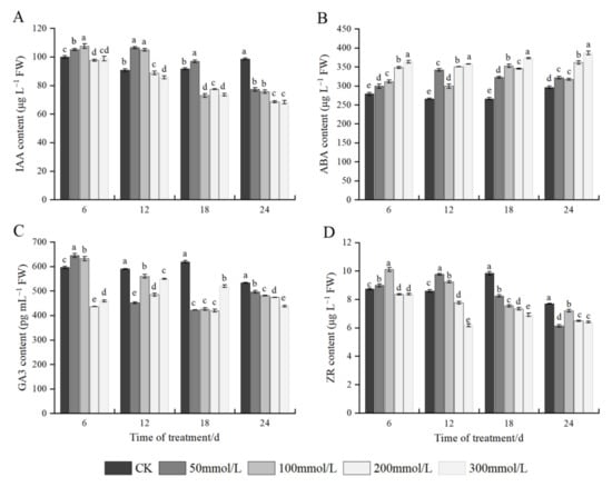 Changes in the ABA content were significantly different among different concentrations of NaCl treatment. Under the same treatment time, the ABA content in the leaves generally showed an increasing trend with an increase in the salt concentration. In addition, the ABA content under each salt treatment was significantly different compared with the control. At 50 and 100 mmol/L concentrations, the ABA content increased at first and then decreased with the prolonged stress time. At 200 and 300 mmol/L concentrations, the ABA content increased with prolonged stress time, but the rate of increase was delayed in the later stages of treatment (Figure 6B).