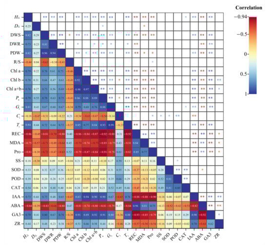 Correlation analysis was performed on the growth and final physiological indexes of J. microcarpa L. seedlings under salt stress (Figure 7). Results showed that HΔ, DWS, and PDW were positively correlated with Chl a + b, Pn, Tr, IAA, and GA3, but negatively correlated with REC, MDA, and ABA. The chlorophyll content was significantly correlated with photosynthetic parameters, and negatively correlated with REC, MDA, and Pro. MDA is a product of membrane lipid peroxidation, and REC reflects the cell membrane permeability, REC was highly significantly correlated with MDA. In addition, we observed a highly significant negative correlation between ABA and IAA, GA3, and ZR. In general, growth indicators are closely linked to changes in physiological indicators. When plants are subjected to salt stress, growth decreases while regulating the content of different substances in the plants to maintain normal functions.