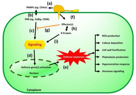 PAMP molecule chitin present on the cell wall of Magnoporthe oryzae could be recognized by rice CEBiP (a chitin elicitor binding protein), a lysin motif (LysM) containing plasma membrane proteins, LYP4 and LYP6 [112]. In order to overcome this PTI response in rice, Magnoporthe oryzae secretes an effector protein, Secreted LysM Protein1 (Slp1), during the pathogenesis of new rice cells. Effector Slp1 accumulates in space between the rice plasma membrane and fungal cell wall and competes with CEBiP for binding of chitin molecules, and defeats plant defense gene expression and generation of reactive oxygen species [90].
