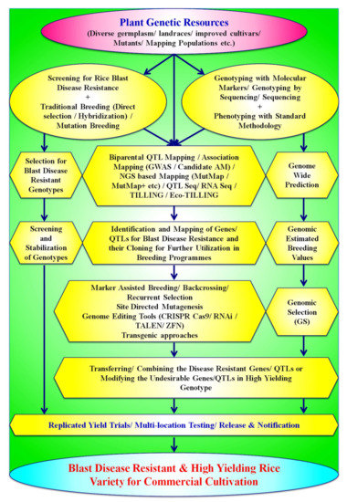 Schematic representation of various breeding biotechnological approaches used for development of blast-resistant rice varieties.