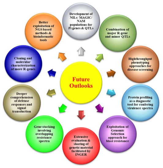 Conventional breeding methods have played a significant role in sustaining food production for burgeoning populations. However, conventional breeding takes more time and effort, which can be reduced nowadays due to advancements in genomic technologies. Conventional breeding and phenotyping are inefficient when several lineages of the pathogen are present, and resistances to multiple lineages are warranted [156]. Moreover, the success in resistance breeding is generally affected by linkage drag, due to which undesired traits closely linked with resistance genes are also transferred in new selections. Therefore, molecular-marker-based breeding approaches are now preferable in resistance breeding towards increasing its efficiency.