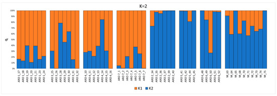 The genetic structure of the onion germplasm under study was first investigated using the parametric model implemented by STRUCTURE [23]. According to the Evanno’s ΔK test [24], two ancestral subpopulations (K = 2) were assumed to best fit genetic data from the germplasm under study (Figure 2 and Figure S1). With a few exceptions, the K1 ancestry was predominant in individuals belonging to the populations ARO1, ARO3, ARO4, and ARO7, further referred to as the ARO_K1 populations. Conversely, the K2 ancestry was predominant in most individuals of the ARO2, ARO5, and ARO6 populations, further referred to as the ARO_K2 populations, as well as in individuals of the M population.