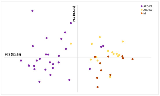 Scatter plot for genetic variation explained by the first two principal components (PCs). Individuals belonging to the ARO_K1, ARO_K2 and M populations are marked with different colors.