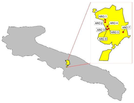 Localization of the different ARO populations genotyped in this study within the municipality borders of Acquaviva delle Fonti (Apulia Region, Southern Italy).