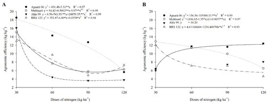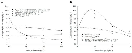 Aguará 06 did not show large variations for APE due to the increase in doses (Figure 3A) in the 2016 harvest. Aguará 06 still obtained higher APE compared to the other cultivars considering the doses of 60, 90, and 120 kg ha−1 (Table 3).