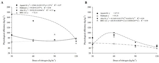 The similarity observed between the cultivars Aguará 06, Multissol, and BRS 122 in doses from 60 to 120 kg ha−1 of N indicates that the N applied in these cultivars presents a similar utilization. A similar PE between cultivars of the same species indicates that they have a similar ability to acquire N to incorporate it into their metabolic functions, such as in biomass production [49].