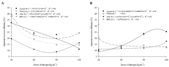For Multissol and Aguará 06, the ARE was higher at the lowest doses. As the N was increased, it reduced the ARE of these cultivars. The increase in ARE tends to increase due to the increase in biomass due to more efficient absorption of N. At lower doses, this can occur through stronger root growth, which enhances absorption and allows for greater N capture [64].