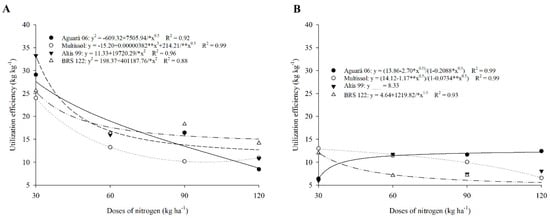 Altis 99 and Aguará 06 for this efficiency obtained higher values with the increase in N, indicating that these cultivars accumulate more nitrogen in the biomass when fertilized with larger amounts of urea; this accumulation of N is directly related to the amount of dry matter found [65]. In addition, the N source used influences the ARE, where ammonium sulfate and urea show better results for this efficiency compared to manure [66].