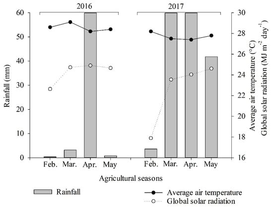 Average daily values of rainfall (mm), average air temperature (°C), relative air humidity (%), global solar radiation (MJ m−2 day−1), and phenological phases (emergency-VE, reproductive stage-R1 and harvest-R9) corresponding to the months of February to May of the 2016 and 2017 agricultural harvests.