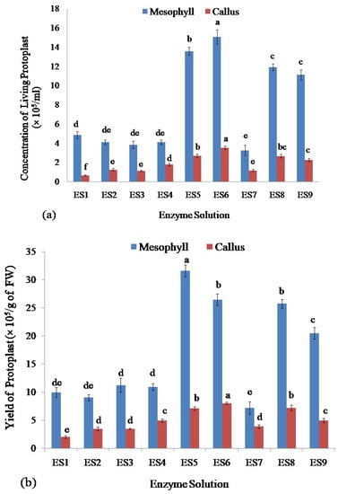 Among all of the enzyme concentrations, ES6 produced the highest concentration of living protoplasts from leaf mesophyll (15.07 × 105/mL) as well as from callus of stevia (3.53 × 105/mL)(Figure 3a) whereasES7 and ES1 concentrations of enzymes released the lowest number of living protoplasts from leaf mesophyll (3.27 × 105/mL) and callus (0.67 × 105/mL), respectively (Figure 3a).