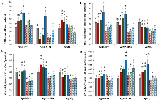 Differences in activites of (A) superoxide dismutase (SOD), (B) pyrogallol peroxidase (PPX), (C) ascorbate peroxidase (APX), and (D) catalase (CAT) in leaves of tobacco plants 7 days after exposure to 25, 50, and 100 μM AgNP–PVP, AgNP–CTAB, and AgNO3, applied either alone or in combination with 125, 250, and 500 μM cysteine (cys). Values are the means ± SE of three biological replicates, each with six technical replicas. If columns are marked with different letters, the treatments are significantly different at p ≤ 0.05 (a two-way ANOVA followed by Duncan’s post hoc test); small letters mark the differences among different concentrations of the same treatment type as well as control; capital letters mark the differences among different treatment types of the same concentration; asterisk (*) denotes significant differences among treatments with and without cysteine of the corresponding concentration, while hash sign (#) denotes significant difference between each treatment with cysteine and control.