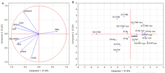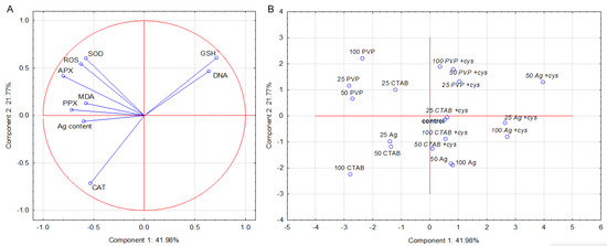 Principal component analysis of leaf data set obtained for tobacco plants 7 days after exposure to 25, 50, and 100 μM AgNP–PVP, AgNP–CTAB, and AgNO3, applied either alone or in combination with cysteine (+cys). (A) loadings and (B) scores of the first two components (PCs). Silver (Ag) content, reactive oxygen species content (ROS), malondyaldehide content (MDA), glutathione content (GSH), DNA damage (DNA), activity of superoxide dismutase (SOD), ascorbate peroxidase (APX), pyrogallol peroxidase (PPX), and catalase (CAT) represent variables that contributed the most to the combined PC1/PC2.