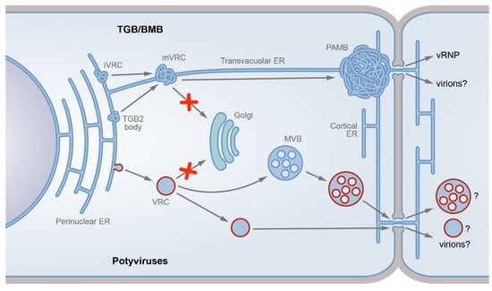 TGB/BMB-specific and potyvirus-specific transport pathways. The two dissimilar pathways described are either modification of the ER tubules (TGB/BMB; upper part) or formation of motile vesicles detached from the endoplasmic reticulum and targeted to endosomes (potyviruses, bottom). In the TGB/BMB-specific pathway, the viral replicase forms initial virus replication complexes (iVRCs) on the ER membrane, whereas TGB2 can interact with the ER to form membrane TGB2 bodies. Due to TGB2 interaction with viral replicase, TGB2 targets iVRCs to convert them into movement VRCs (mVRCs). The mVRCs are capable of intracellular transport and can be transported along the cytoskeleton to the PD entrance, bypassing the Golgi-dependent trafficking pathway (shown by red cross sign). At the PD entrance, mVRCs form PD-associated membrane bodies (PAMBs), which represent ER-derived PD-anchored sites where virus replication is coupled to cell-to-cell virus transport. Virus ribonucleoprotein complexes (vRNPs) containing genomic RNA and MPs are formed in PAMBs and directed to the PD channels. Alternatively, virions, likely MP-modified, can be the virus transport form (indicated by question mark). In the potyvirus-specific pathway, the viral 6K2 protein induces the formation of VRCs on the ER membrane. The potyvirus VRCs, which carry viral proteins, virus RNA, and cellular factors, are detached from the ER membrane in a COPII-dependent manner. Further VRC intracellular trafficking bypasses the Golgi pathway (red cross sign). The VRCs target late endosomes (multivesicular bodies, MVBs), which in turn target PD. Alternatively, the VRCs can directly target PD. The potyvirus-specific entity transported through the PD channels is unknown and can be VRC, modified MVB, or virion (indicated by question marks).