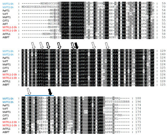 With regards to the two MiTFL1 genes isolated from ‘Shelly’, sequence analysis indicated that their translated sequences share 99.4% identity with the translated versions of two TFL1 genes isolated from ‘Alphonso’ (MiTFL1 and MiTFL1) [49], and also correspond to the translated sequences of MiTFL1-1 and MiTFL1-2 from ‘SiJiMi’ [51] (see Figure S1C,D). A detailed examination of their translated sequences revealed that both clones exhibit 68.5–80.2% similarity to TFL1 proteins from other plant species (not shown), and contain the two crucial conserved amino acid residues, His-85 and Asp-140 (corresponding to AtTFL1), which are required for their anti-florigenic function [27,33,34] (see Figure 2).
