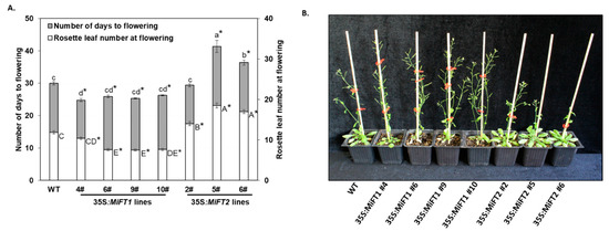 To further investigate the functions of the isolated ‘Shelly’ MiFT/MiTFL1 genes in flowering regulation, their cDNA (driven by the cauliflower mosaic virus (CaMV) 35S promoter) was individually ectopically expressed in wild-type (WT) Arabidopsis Col-0 plants (see Section 4.3). After transformation with the pART27 35S:MiFT constructs, nine independent PCR-positive 35S::MiFT1 and four independent PCR-positive 35S:MiFT2 kanamycin-resistant plants were obtained. All of the 35S:MiFT1 plants were phenotypically distinguishable from the WT plants and exhibited an early flowering phenotype under inductive long-day (LD) conditions. In contrast, the MiFT2-overexpressing plants displayed different degrees of late flowering phenotype under the same conditions (not shown). We then used the F3 progeny of four 35S:MiFT1 and three 35S:MiFT2 homozygous lines for detailed phenotypic analysis, together with the non-transformed control plants. In all 35S:MiFT1-transgenic lines, MiFT1 promoted a significantly early floral transition under inductive LD conditions. In contrast, under the same conditions, MiFT2 did not induce early flowering (Figure 3). Specifically, the 35S:MiFT1-transgenic lines flowered within 25–26 days of seed sowing after producing 7–10 rosette leaves, whereas WT control plants flowered within 30 days of seed sowing, after producing 12 rosette leaves. 35S:MiFT2 plants flowered within 31–42 days of seed sowing, after producing a significantly higher number of rosette leaves (14–18) than the WT plants. Except for the altered flowering time, no obvious floral phenotypes were observed in either 35S::MiFT1- or 35S::MiFT2-transgenic plants (Figure 3B).