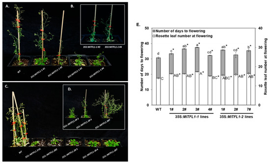 Ectopic expression of ‘Shelly’ MiTFL1-1 and MiTFL1-2 genes in Arabidopsis. 35S:MiTFL1-1- and 35S:MiTFL1-2-transformed plants exhibit late flowering phenotype relative to WT plants and display branched phenotype and/or shoot-like inflorescences. Photographs were taken 66 and 72 days from sowing (A,C), and 94 and 103 days from sowing (B,D). Comparison of flowering phenotypes of Arabidopsis Col-0 (WT), four lines constitutively expressing MiTFL1-1 and three lines constitutively expressing MiTFL1-2, under LD conditions (E). Values represent means + SE of number of days to flowering and number of rosette leaves at flowering; n = 17–35 plants per line. Different small or capital letters indicate significant differences of number of days to flowering or rosette leaf number at bolting, using Tukey–Kramer multiple comparison test, with p ≤ 0.05. Asterisks (*) denote a significant difference between the control and a specific 35S:MiTFL1-1- or MiTFL1-2-overexpressing line, using least significant difference (LSD) test, according to pairwise comparison by Student’s t-test, with p ≤ 0.05.