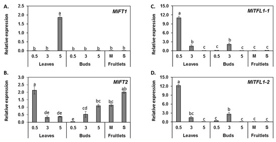 Expression of MiFT/TFL1 genes in various tissues. Expression profiles of MiFT1 (A), MiFT2 (B), MiTFL1-1 (C) and MiTFL1-2 (D) genes in leaves and buds of 0.5- or 3-year-old seedlings and 5-year-old grafted ‘Shelly’ trees, and in fruitlet Mesocarp (M) and Seed (S) tissues. The data are mean of three replicates ± SE. Different letters indicate significant differences according to Tukey–Kramer multiple comparison test, with p ≤ 0.05.