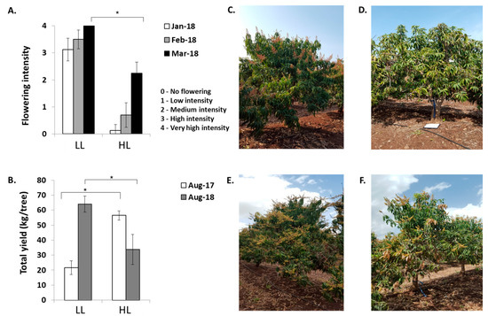 Effect of fruit load on flowering and on the next year’s total yield. (A) Flowering-intensity levels. (B) Total yield. Uniform HL and LL trees were selected at the beginning of May 2017. Flowering levels were ranked from the end of January 2018 through March 2018, as decribed in Figure 1. Total yield of fruit developing from fruit set in March 2017 was determined in August 2017 and in August 2018 by weighing all fruit harvested from the selected trees. Values represent means ± SE of six trees. Asterisks (*) denote a significant difference at the same time point, or between seasons, using least significant difference (LSD) test, according to pairwise comparison by Student’s t-test, with p ≤ 0.05. (C–F) Images of LL and HL trees selected based on their fruit load intensity at the beginning of May 2017. Photographs were taken in January 2018 (C,D) and March 2018 (E,F).