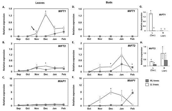 Next, we carried out real-time qPCR analyses to monitor MiFT/TFL1 expression patterns in leaves and terminal buds that were sampled from September 2017 to February 2018 from previously LL or HL trees. LL leaves revealed a sharp increase in MiFT1 expression from November through December, followed by a decrease in transcript accumulation in January and February. In the leaves of HL trees, MiFT1 followed a different pattern. In this case, MiFT1 expression was very low until December, and then it marginally increased (Figure 7A). Furthermore, in a parallel examination of MiFT1 accumulation in the buds, it was nearly undetectable throughout the sampling period under both conditions (Figure 7D). Lastly, a comparison of MiFT1 transcript accumulation in leaves and buds of HL vs. LL trees, at the time points at which expression was maximal, revealed a significantly higher accumulation in the leaves of the LL trees (Figure 7G).
