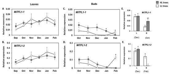 MiTFL1-1 and MiTFL1-2 expression in leaves from trees under both fruit load conditions displayed a similar moderate upregulation from September to February (Figure 8A,B). Both transcripts only accumulated to slightly higher levels in the HL leaves in September. The bud analyses revealed different results. As shown in Figure 8C,D, starting from October, and coinciding with a decrease in the regional maximum and minimum temperatures (see Figure S3), both MiTFL1-1 and MiTFL1-2 exhibited a downregulation pattern, reaching close to null levels in HL trees in February. In LL trees, there was an increase in MiTFL1-1 and MiTFL1-2 levels from January to February. Moreover, the rate of decrease in MiTFL1s levels was higher in the LL vs. HL trees and therefore in January, MiTFL1-1 expression remained significantly higher in the HL trees. Finally, a comparison between MiTFL1-1 and MiTFL1-2 expression in leaves and buds on the sampling dates with maximal expression showed that overall, both transcripts accumulated to higher levels in the leaves than in the buds (see Figure 8E,F).