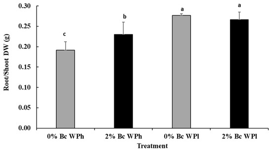 Root–shoot ratio in Medicago ciliaris after 3 weeks of drought treatment. Values represent mean ± SE (n = 5) and the different letters a to c indicate significant differences between the treatments. Low soil water potential (WPl), high soil water potential (WPh), Biochar (Bc).