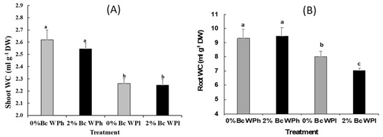 Shoot water content (A) and root water content (B) in Medicago ciliaris after 3 weeks of drought treatment. Values represent mean ± SE (n = 5) and the different letters a to c indicate significant differences between the treatments. Low soil water potential (WPl), high soil water potential (WPh), Biochar (Bc).