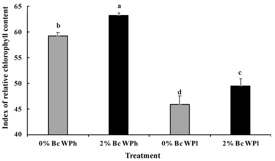 The soil improvements with Bc jointly contribute to the increase on the physiological and biochemical performances of plants and consequently promote plant biomass production. These beneficial effects of Bc were reported in several species, such as maize and rice [48].