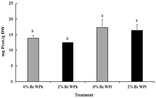 Leave protein content in Medicago ciliaris after 3 weeks of drought treatment. Values represent mean ± SE (n = 5) and the different letters a and b indicate significant differences between the treatments. Low soil water potential (WPl), high soil water potential (WPh), Biochar (Bc).