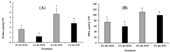 Changes in Proline (A) and MDA (B) content in Medicago ciliaris leaves after 3 weeks of drought treatment. Values represent mean ± SE (n = 5) and the different letters a to d indicate significant differences between the treatments. Low soil water potential (WPl), high soil water potential (WPh), Biochar (Bc).