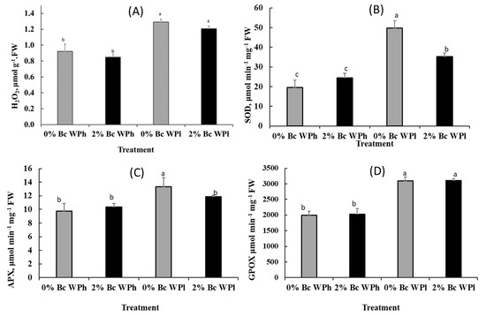 Drought stress caused an increased accumulation of H2O2 in the leaves of Medicago ciliaris treated with and without biochar (Figure 7A). It is noticeable that higher H2O2 values correlate with lower chlorophyll content (see Figure 4) and lower photosynthetic activity (see Table 2). The drought induced an increase in reactive oxygen species (ROS), such as H2O2, making it necessary to also measure the antioxidant enzyme activities.