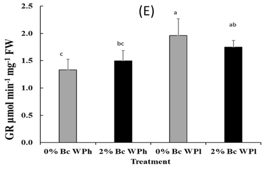 Varietal differences in the content of H2O2 (A) and the enzymatic activities of SOD (B), APX (C), GPOX (D), and GR (E) in Medicago ciliaris leaves after 3 weeks of drought treatment. Values represent mean ± SE (n = 5) and the different letters a to c indicate significant differences between the treatments. Low soil water potential (WPl), high soil water potential (WPh), Biochar (Bc).