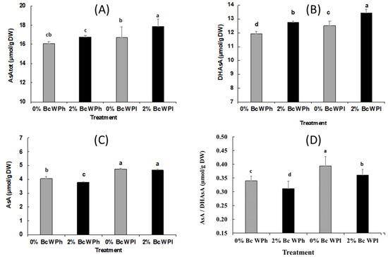 The content of total ascorbate (AsA + DHAsA) (A), AsA, (B), DHAsA (C), and AsA/DHAsA ratio (D) in Medicago ciliaris leaves after 3 weeks of drought treatment. Values represent mean ± SE (n = 5) and the different letters a to d indicate significant differences between the treatments. Low soil water potential (WPl), high soil water potential (WPh), Biochar (Bc).