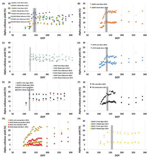 Seasonal distribution of alpha-cellulose yields of leaf samples of eight broadleaf species. (A) pedunculate oaks (Quercus robur L.), (B) pubescent oak (Quercus pubescens Wild.), (C) European beech (Fagus sylvatica L.), (D) sycamore maple (Acer pseudoplanatus L.), (E) sessile oaks (Quercus petraea (Matt.) Liebl.), (F) Large-leaved lime (Tilia platyphyllos Scop.), (G) Scots elm (Ulmus glabra Huds.), (H) Turkey oak (Quercus cerris L.). Colored-in squares and circles denote blades and veins, respectively, while the empty symbols indicate potential cellulose extraction failures. Ordinate and abscissa represent the alpha-cellulose yields in percentage and the Day of Year (DOY), respectively. The gray shading indicates the transition from the juvenile to the mature phase.