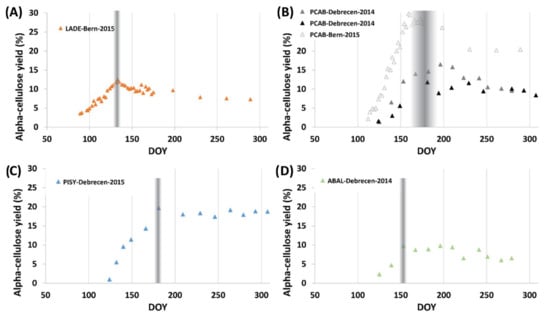All investigated species, including both gymnosperm and angiosperm species, show a seasonal trend starting with a characteristic increase in alpha-cellulose yield followed by a set of quasi-constant values. These dynamics, as documented in studies investigating the leaf area index (LAI) [,,], represent the temporal course of leaf development. The lowest alpha-cellulose yield was documented for the initial samples, representing the leaf expansion phase. As the leaves develop and the LAI increases, the alpha-cellulose content simultaneously increases, providing the necessary structural support. Although this increasing trend of alpha-cellulose content was observed for each species, its structure (slope and duration) varied (Figure 1). Thus, it was possible to differentiate among broadleaf species with faster (Fagus sylvatica, Quercus petraea) and moderate leaf expansion (e.g., Quercus robur, Acer pseudoplatanus, and Tilia platyphyllos) as was also the case in previous LAI monitoring studies [,,]. Usually, a more elongated juvenile phase characterized the needle species (Figure 2) which developed their leaves rather slower compared to the broadleaf trees [,].