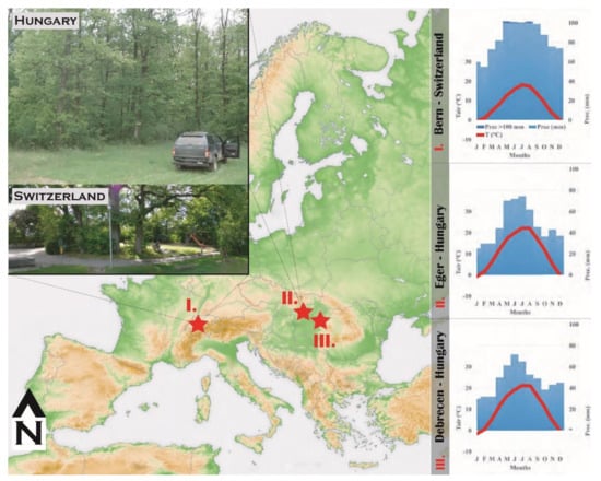 Sample sites in Hungary and Switzerland (red stars) with the corresponding climate diagrams (I–III).