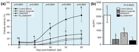 Effect of two bis-chalcone derivatives, DMAPAPP and Ru-DMAPAPP, on the development of pepper Fusarium wilt disease caused by Fusarium equiseti under greenhouse conditions. (a) Disease progress curves of fusarium wilt disease on pepper plants after treatment with DMAPAPP and Ru-DMAPAPP. (b) The area under the disease progress curve (AUDPC) of fusarium wilt disease on pepper plants after the treatment with DMAPAPP and Ru-DMAPAPP. Values represent the means ± standard deviations. Different letters indicate statistically significant differences between treatments using the Tukey–Kramer honestly significant difference test (Tukey HSD; p < 0.05).