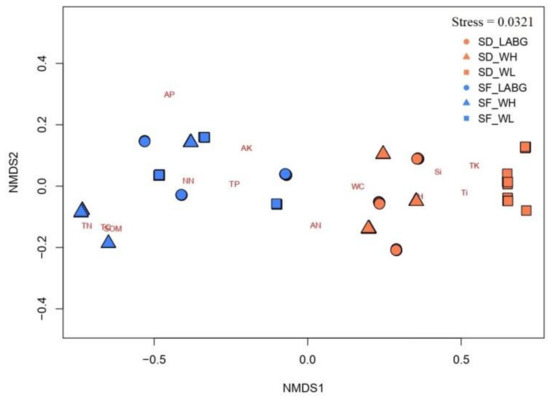 Non-metric multidimensional scaling (NMDS) ordination plot of physical and chemical properties of soil samples collected near flowering individuals of S. digitaloides and S. flava. Circle, triangle, and square symbols with coral color denoted Lijiang Alpine Botanical Garden (LABG), Wenhai Village (WV), and Wenhai Lake (WL) study sites of S. digitaloides. Circle, triangle, and square symbols with blue color denoted LABG, WV, and WL study sites of S. flava. The measured soil properties were soil water content (WC), pH, soil organic matter (SOM), total nitrogen (TN), nitrate-nitrogen (NN), ammonium nitrogen (AN), total phosphorus (TP), available phosphorus (AP), total potassium (TK), available potassium (AK), silicon (Si), total carbon (TC), and titanium (Ti). Permutational multivariate analysis of variance (PERMANOVA) was used to compare soil properties between the two species at different sites.