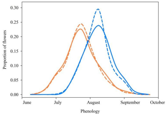 Variations in flowering phenology among co-existing plant species can be viewed as niche partitioning mechanism that promotes species coexistence and diversity. Like other findings from the same focal study sites [12,25,30], we found that the two species bloomed in the same period from June to July, suggesting that phenology isolation due to the flowering time is relatively weak. Our findings are inconsistent with sympatric S. apiana and S. mellifera which bloomed at different times of the year in North America [37]. A few studies have suggested that flowering time can vary among sympatric species or among populations within the same species at both the population and community levels [11,25,37]. Conversely, a recent study suggested that populations of H. limprichtii and H. davidii in the Hengduan Mountain in the northern region of Yunnan shared flowering times [25]. In the present study, although the three populations had slight differences in the slop orientation, we did not find any difference in flowering time among the populations or years. This could be due to restricted population sizes located within the same elevation ranges. Future studies may focus on flowering phenology of the two species at a large scale. Nevertheless, the current results suggest that the strength of phenology isolation between the two species is relatively low. Thus, there could be opportunities for interspecific pollination unless other mechanisms (e.g., flower–pollinator interactions) restrict the gene flow.