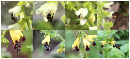 Flowering individuals of Salvia digitaloides (from (A–D)) and S. flava (from (E–H)) and their pollinators. Bombus secures (A), B. friseanus (B), Dufourea carbopila (C), and Macroglossum pyrrhosticta (D) visiting flowers of S. digitaloides. B. remotus (E), B. funararius (F), Apis cerana (G), and Macroglossum nycteris (H) visiting flowers of S. flava.
