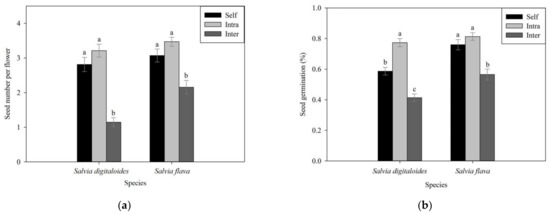 (a) Seed production and (b) germination of hand self- (black bars), intra- (light gray bars), and interspecific (dark gray bars) pollinations for Salvia digitaloides and S. flava. Different letters indicate significant differences at p < 0.05. Error bars represent mean ± standard errors.