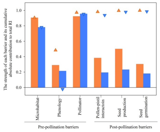 The degree of six barriers (bars) and their accumulative absolute contributions (triangle symbols) to total isolation in reciprocal crosses of the two species. Bars and triangle up symbols with coral color represent S. digitaloides, while bars and triangle down symbols with blue color represent S. flava.