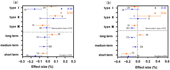 The absorption of AM and ECM plant N responded differently to the type and duration of DS operation. For AM plants, the average effect size, in the constant-stressed type, was significantly lower than zero (a 0.1581% reduction on average, Figure 2a). Treatment time had an obvious effect on AM plant N absorption. The average effect size of AM plant N in the short-term (<90 d) treatment has a significant reduction (−0.1495%, Figure 2a), while there was no significant difference in the long-term (>90 d) treatment. The N ECM plants absorb varies most during drying–rewetting cycle type operations (+0.0844%, Figure 2a). As for the effect of treatment time, ECM and AM plants are affected the most under short-term treatment, but AM plant N are affected more than ECM plants.