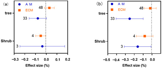 Analysis and comparison of 155 data results showed that drought stress had significantly different effects on the N, P, and N:P ratio of AM and ECM plants (Figure 1). The N, P, and N:P ratio effect sizes and their 95% CIs did not overlap with 0 for AM plants, indicating a significant DS effect. The 95% effect interval of ECM plants overlapped with 0, and there were no significant differences in ECM plant N, P and N:P ratio (p = 0.3187, p = 0.4249, p = 0.0531). These results indicated that the responses of N and P to drought stress were obviously different between AM and ECM plants (Figure 1).