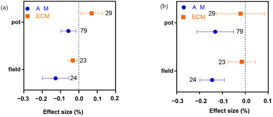 We used two planting conditions altogether—pot and field. Drought has a great influence on N concentration in both field and pot cultivations conditions, but the effect of drought on N in field experiment is greater than that of pot cultivation experiment (−0.1269%, Figure 6a). The absorption of P by AM plants decreased in both field and pot experiments (by 0.1451% and 0.1317%, respectively, Figure 6b). In field experiment, the absorption of the N:P ratio was not significantly affected, but the absorption of the N:P ratio, in pot experiment, was positively affected (+0.0994%, Figure 6c). For ECM plants, field experiment had a negative effect on N absorption, but the effect was smaller than that of AM plants. The N absorption of ECM plants had a positive effect in Pot experiment, and more than AM plants, but P does not change (Figure 6a). There was no significant difference in the effect of ECM plants on P in field and pot experiments (Figure 6b). The N:P ratio of ECM plants was improved in pot experiment (+0.1092%, Figure 6c), which was significantly higher than that under field conditions (a decrease of 0.0538, Figure 6c). In addition, the effect of ECM plant N:P ratio was greater than that of AM plants in both field and pot conditions.