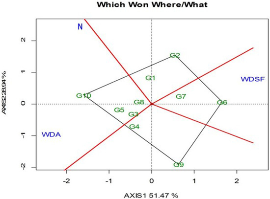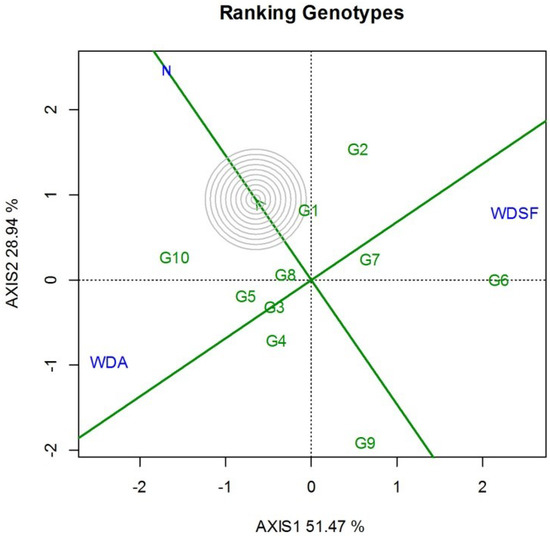 The GGE biplot is based on the mean SY of each genotype for the three irrigation levels, with the “which-won-where” indicating two groupings (Figure 1). Genotype G10 followed by G5, G3, and G8 were the best performing in the normal irrigation (N) and WDA, whereas the G6 followed by G7 was the best at WDSF. The G10 was the best performing in overall SY in the N (197.22 g plant−1) and WDA (192.78 g plant−1), followed by G8 which was not significantly inferior (Table 2). The G2 and G6 was the highest yielding at WDSF (197.43 and 196.71 g plant−1).