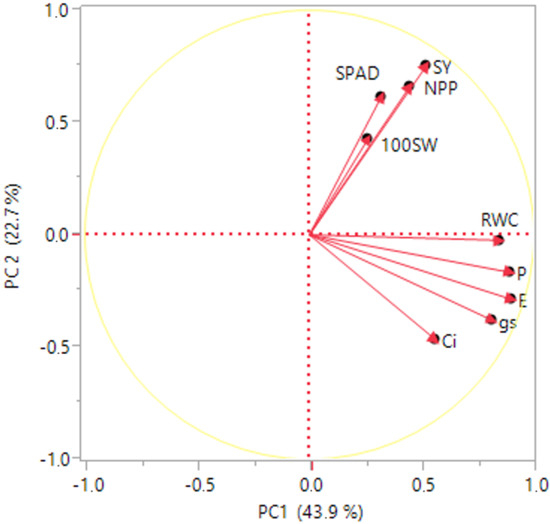 Principal component analysis (PCA) for SY, seed yield (g plant−1); NPP, number of pods plant−1; NSP, number of seeds pod−1; 100SW, 100 seed weight; RWC%, relative water content; SPAD, chlorophyll content; Pn, net photosynthetic rate; gs, stomatal conductance; Ci, intercellular CO2 concentration; E, transpiration rate.