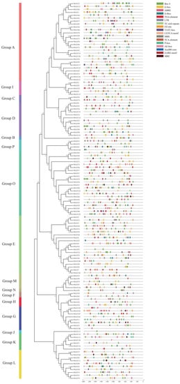The phylogenetic tree was constructed from 129 members of the PhUGT family and 21 members of the AtUGT family (Figure 1). A total of 16 groups of the UGT family were detected, which were named A–P, based on identified group in Arabidopsis. There were various numbers of UGTs in each group. Twenty-seven UGT members comprised group A, the largest group, while groups B, J, and N, had just one member. Groups C, D, E, F, G, H, I, K, L, and M had 2, 12, 20, 2, 8, 3, 5, 6, 10, and 5 members, respectively. Our analysis discovered two new groups, O and P, with 22 and 4 PhUGT members, respectively.