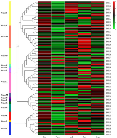 Expression heat map of different tissues of Petunia UGT family members.